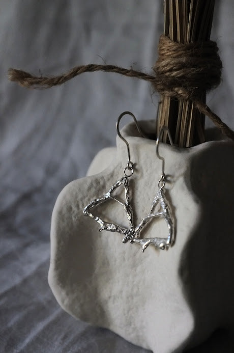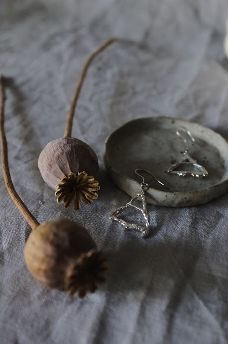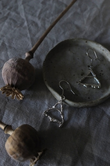 Starting out as a rough triangle with silver offcuts dotted around the edge, these earrings are made by melting the silver so that it flows together.