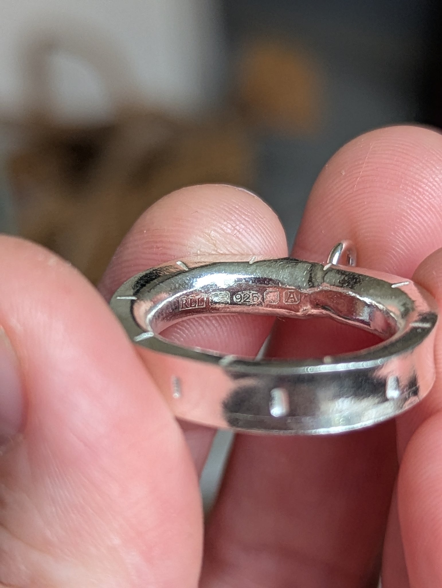 The pendant sits on an 24" Spiga chain, and has been hallmarked at The London Assay Office as 925 Sterling Silver.