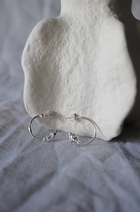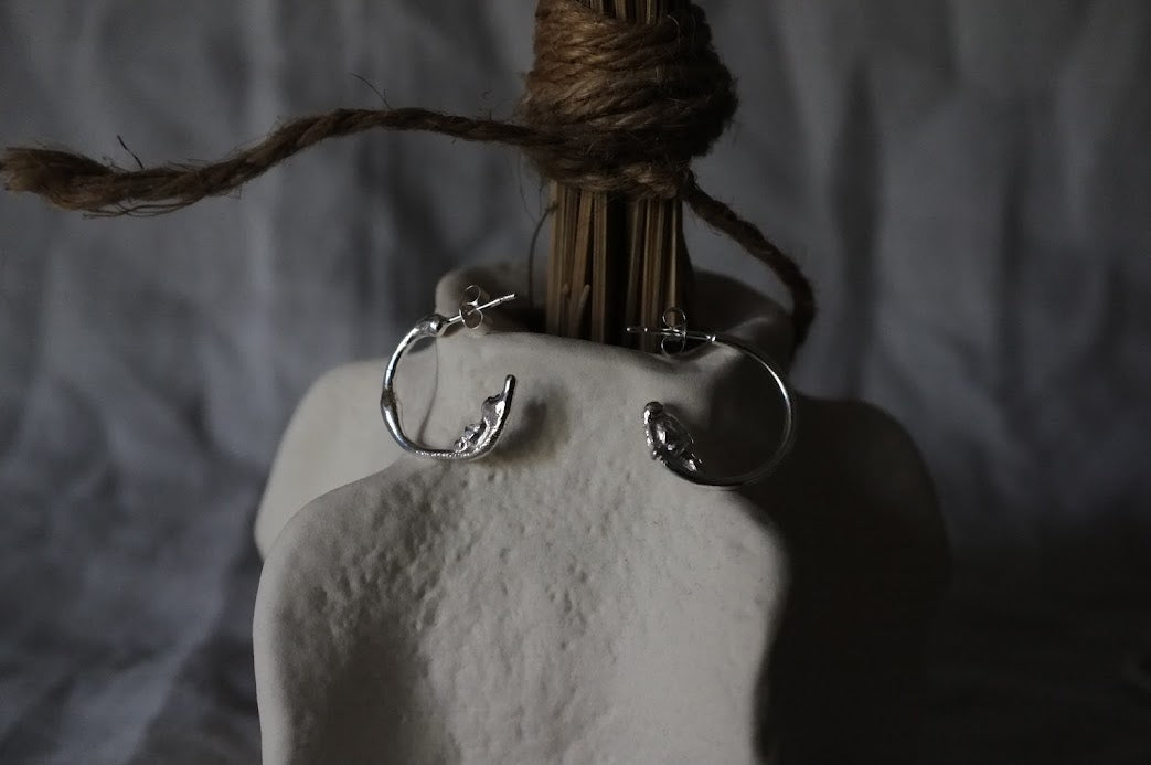 Starting out as a circle with silver offcuts dotted around the edge, these earrings are made by melting the silver so that it flows together.
