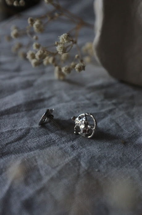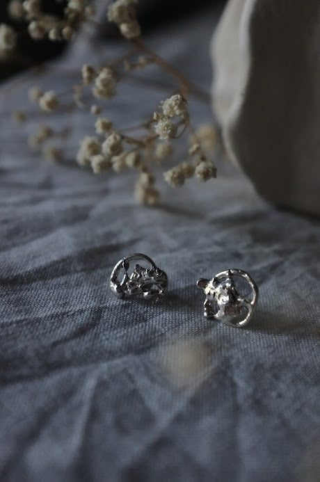 Starting out as a circle with silver offcuts dotted around the edge, these earrings are made by melting the silver so that it flows together.