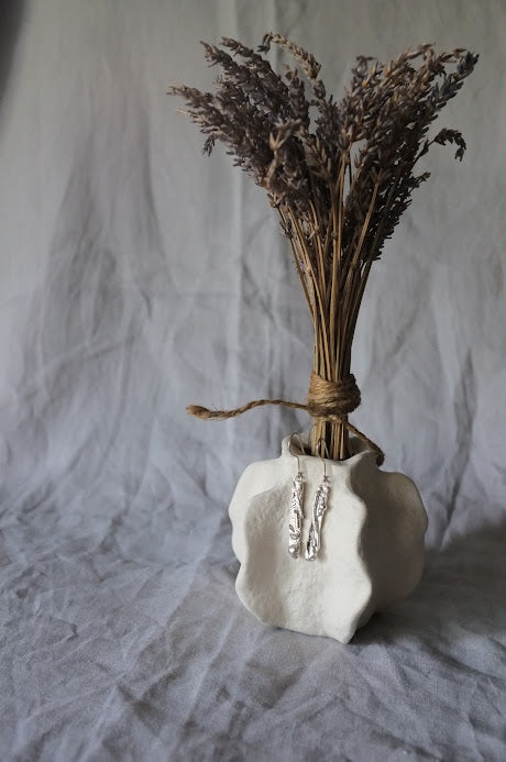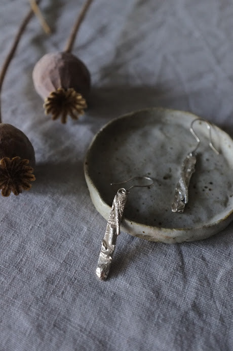 Starting out as two lengths of recycled sterling silver with offcuts laid along side, these earrings have been made by melting the silver so that it flows together.